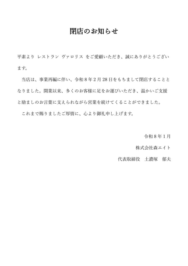 ヴァロリス閉店のお知らせ